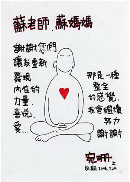來自香港的宛珊,2006年七月第一次來台灣參加斷食營後,畫了這幅畫送給蘇老師與蘇媽媽。 2008年1月,宛珊第二次來台南玉井,再來尋訪她內在力量的泉源,這幅插畫抵過千言萬語,有來玉井斷食經驗的神仙們,看了這靜坐的圖像,大概都會會心一笑,回憶起玉井的晨星晚風,回味著宛珊描繪的:喜悅與愛
