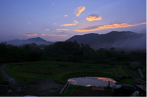 這時是清晨4點50分,2008年八月,十日自然療法營的第七日。 四周一片靜寂,天際泛著藍光,房舍間有微弱的光線,蘇老師正在準備他的吉他,要用吉他伴著歌聲叫學員起床,我及早起床等待日出,期望天空再出現昨日清晨火紅的彩雲。在日出之前,先來到營舍旁,把相機快門放慢,紀錄這一天最美好的時光
