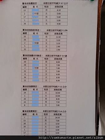 我在7天裏,瘦了5.6公斤,體脂少了3%, 體內年齡由36降至29歲,腰圍和臀圍收了5cm (非常高興,回到24腰了)。